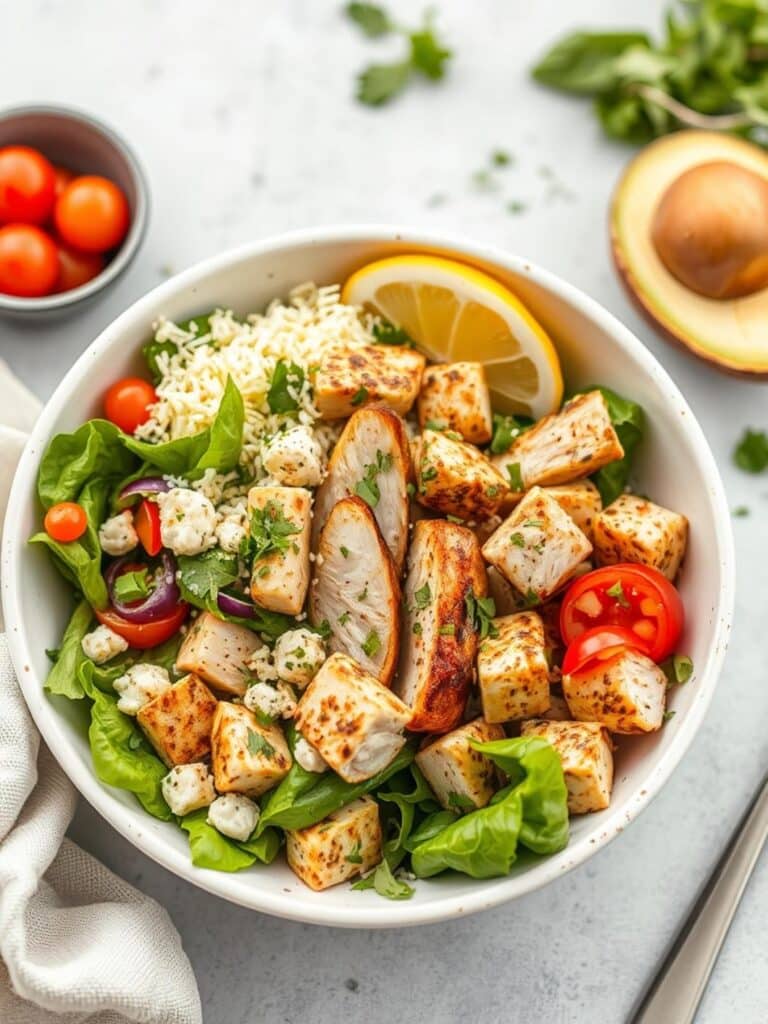 In a large bowl, combine the mixed greens, cherry tomatoes, feta cheese (if using), and sliced chicken.