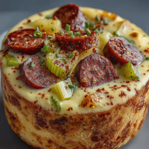 Serve piping hot with a garnish of sliced green onions and extra crispy sausage rounds on top. A dash of hot sauce adds a vibrant red pop.