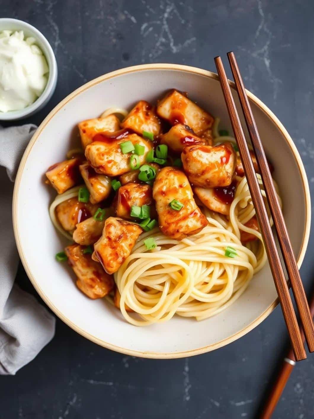 This dish has a rich, savory flavor and a delightful sticky texture from the sauce, accompanied by tender chicken and springy noodles. The garlic flavor is pronounced but balanced, making it a great option for garlic lovers.
